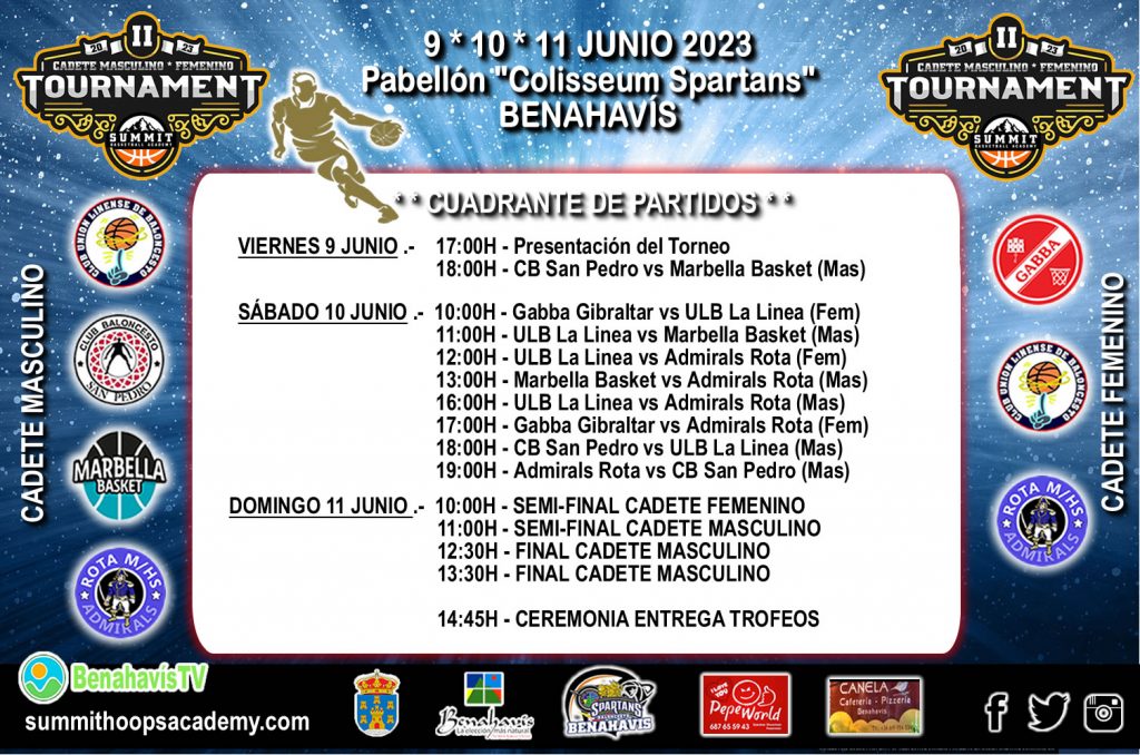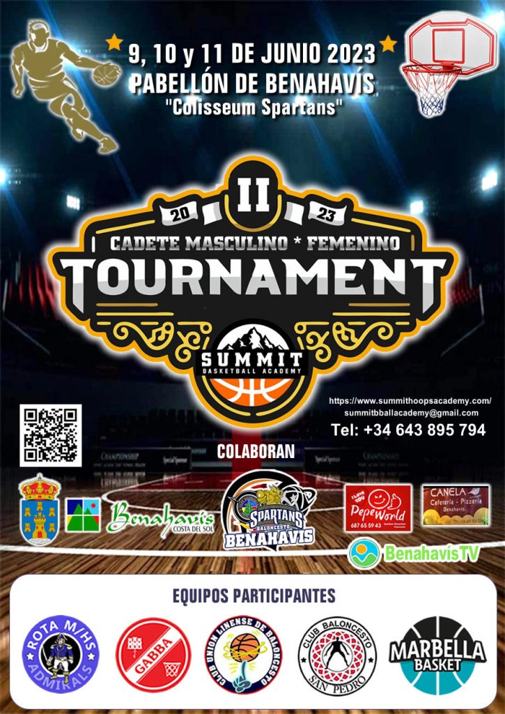 El próximo viernes 9, sábado 10 y domingo 11 de junio de 2023 tendrá lugar en el pabellón de Deportes de Benahavís, “Colisseum Spartans”, el “II Torneo Summit Basketball Academy – Benahavís”, esta nueva edición en categoría Cadete Masculino y Femenino, organizado por su fundador y entrenador, el pivot canadiense Evan Pellerin, con la colaboración especial del club local, el CB Benahavís Costa del Sol, del Ayuntamiento de Benahavís, del speaker/showman Pepe World, de “Benahavis TV“, de la Pizzería “Canela” de Benahavís, y de Joaquin Cánovas (Fotografía).