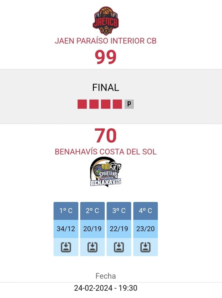 Sus jugadores referentes, Santa Barbara, Cañete, Martínez, y el gigantón de 2m20, Mabior, rebotes ofensivos y con un publico numeroso, le dieron el sábado 24 de febrero 2024, 19:30h, al equipo local de Jaen CB, la victoria merecida por el resultado final de 99 a 70.