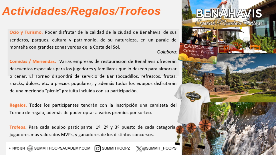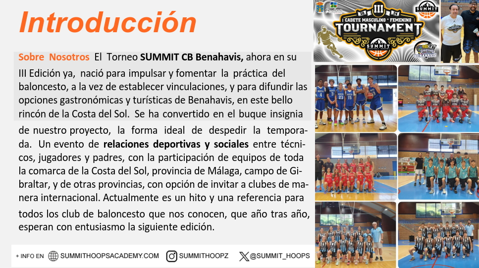 La organización se complace en anunciar que después de una primera y segunda edición muy exitosas, el «III Torneo Summit Basketball Academy – CB Benahavís» continuará con su tradición en el hermoso paraíso natural de Benahavis. Se continua con la ampliación del registro de equipos este año para dar cabida a las categorías de niños y niñas en edad cadete. Cada categoría tendrá la oportunidad de participar en la competición por grupos durante el primer días del Torneo, antes de determinar los cabezas de serie y pasar a los Playoffs el último día. Cada equipo jugará un mínimo de 3 partidos a lo largo del Torneo.