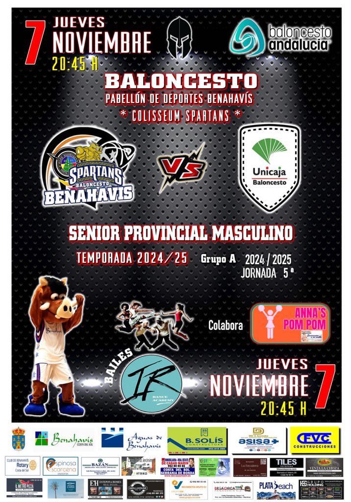 El Club Baloncesto Benahavís Costa del Sol juega de nuevo como local este próximo jueves 7 de noviembre de 2024, para disputar en el “Colisseum Spartans”, la Jornada 5ª de Liga Senior Provincial FAB Málaga, donde se enfrentará, a partir de las 20:45 horas al equipo de “UNICAJA ANDALUCIA».