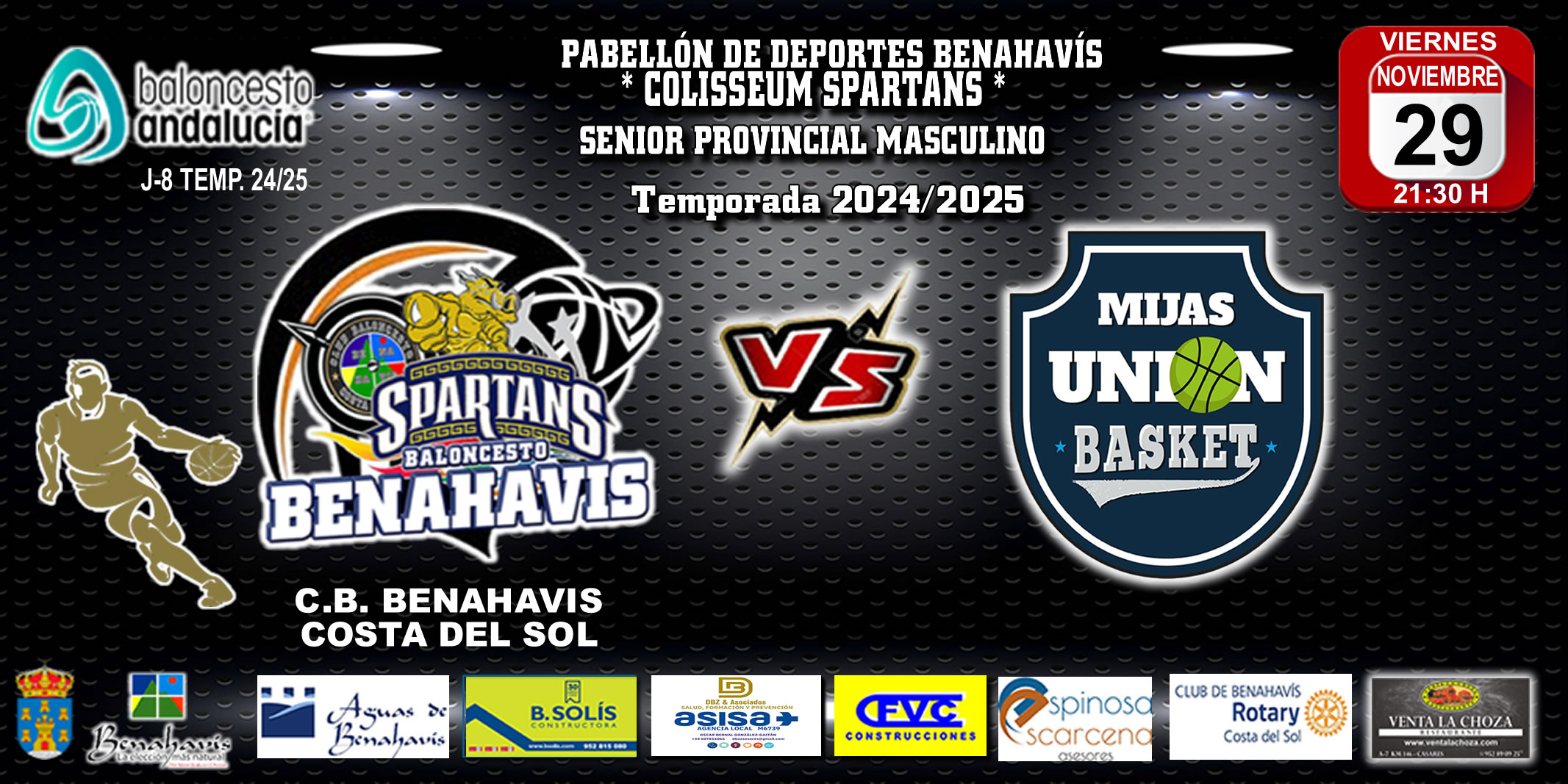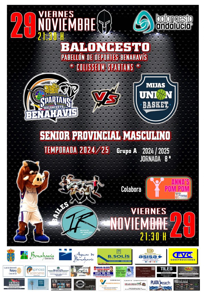 El Club Baloncesto Benahavís Costa del Sol juega de nuevo como local este próximo viernes 29 de noviembre de 2024, para disputar en el “Colisseum Spartans”, la Jornada 8ª de Liga Senior Provincial FAB Málaga, donde se enfrentará, a partir de las 21:30 horas al equipo de “EPICURUS MIJAS UNION BASKET».