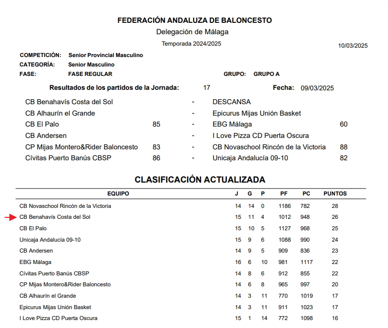 Victoria 11° del CB Benahavis Costa del Sol en su casillero, que le mantiene en la 2a posición provisional de la clasificación Senior Provincial Temp. 24/25.