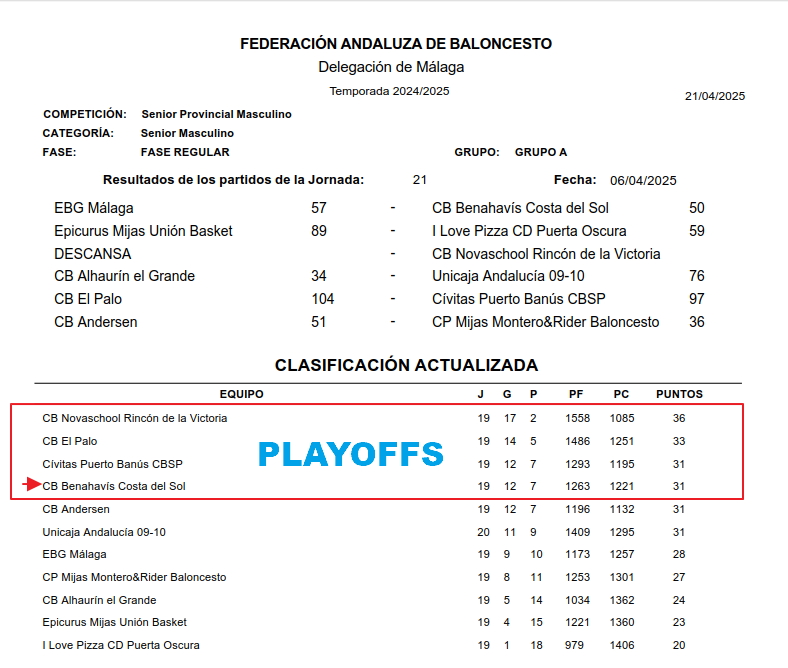 El equipo de Benahavis, que debido a varias bajas importantes no ha podido sumar victorias en sus dos últimos encuentros, es 4º en la clasificación del grupo A, empatado en el 3er puesto. Depende de si mismo para este último partido, esperando recuperar alguna de sus bajas, y a pesar de todas las dificultades sigue trabajando duro en los entrenamientos para prepararse para este último importante compromiso de Fase Regular.