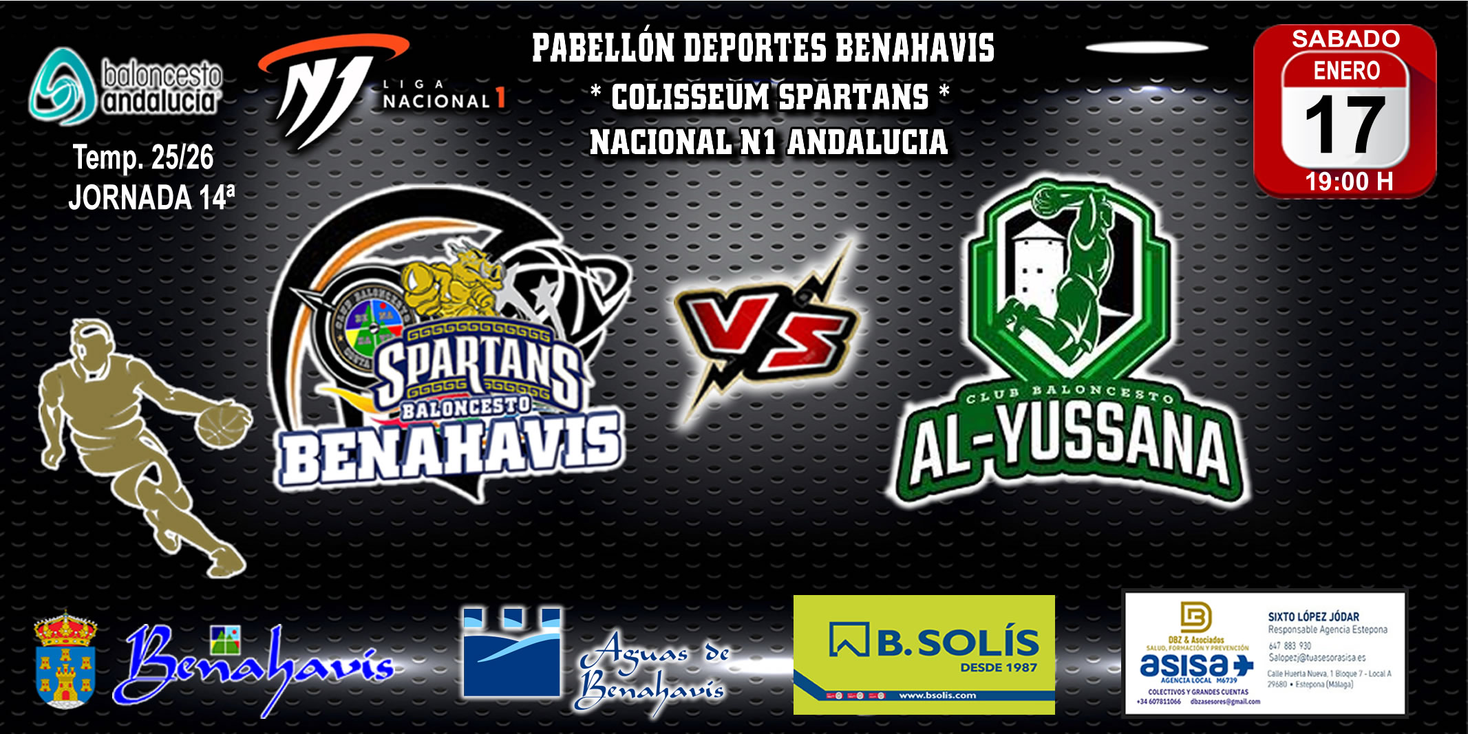 Se disputará en el pabellón «Colisseum Spartans», este sábado 17 de enero de 2026, a partir de las 19:00 horas, y se enfrentará al equipo cordobés del «CB AL-YUSSANA LUCENA».