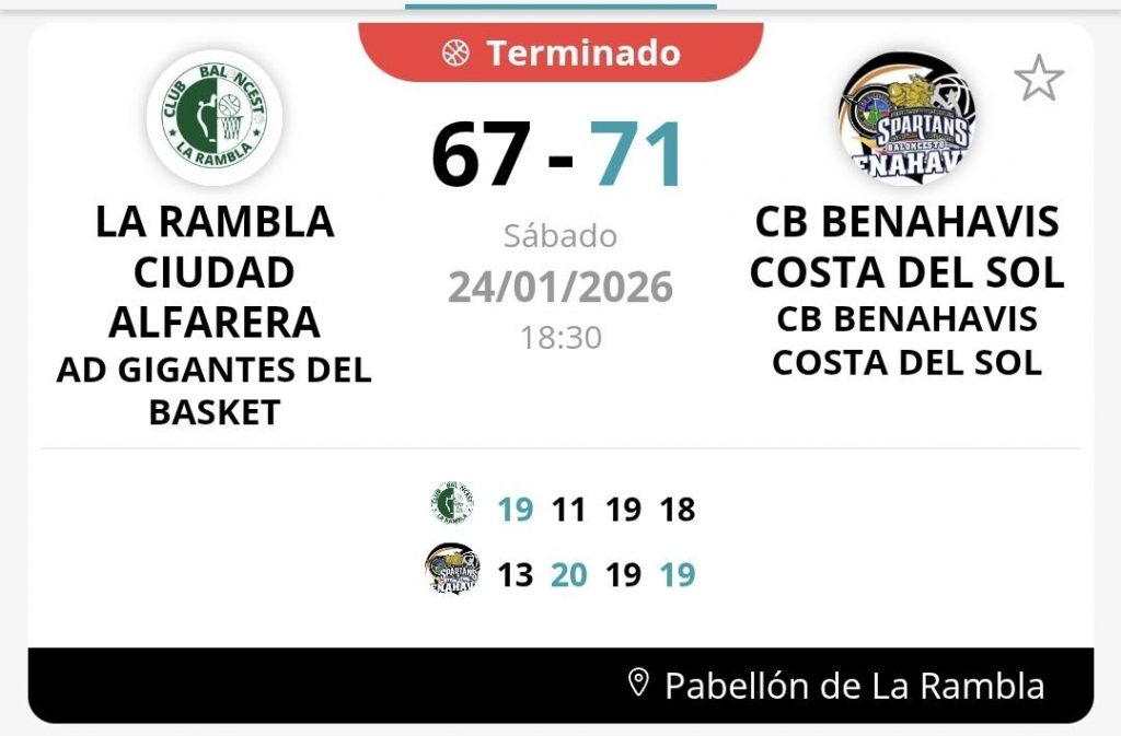 Nuestros Spartans demostraron carácter y buenas defensas, trabajando cada ataque y llegando a ventajas de 14 puntos. Los de La Rambla a base de triples remontaban y se ponían por delante con 6 puntos de ventaja. Ultimo arreón de Benahavis en el parcial definitivo, para ponerse de nuevo 5 puntos por delante a 1m30 para el final. De infarto este ultimo parcial ante un publico entregado, pero Benahavis jugó bien estos últimos instantes, y se llevaba merecidamente este importante triunfo a su casillero.