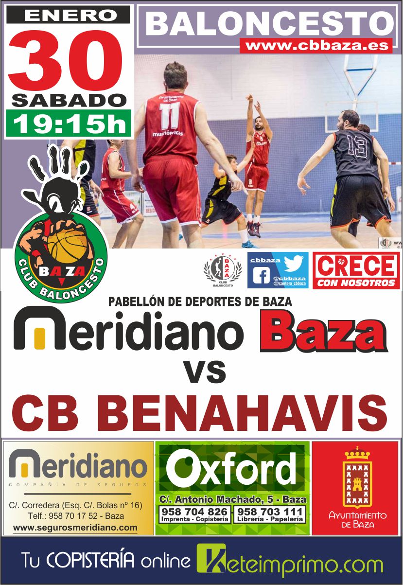 El Club Baloncesto Benahavís Costa del Sol se desplaza este sábado 30 de enero 2016, a la ciudad de Baza (Granada), para el segundo partido de la segunda vuelta del campeonato, en la jornada 12ª de 1ª División Nacional de Andalucía, donde se enfrentará a las 19:15 horas, en el pabellón municipal de deportes de la localidad granadina, al equipo del CB Meridiano Baza.