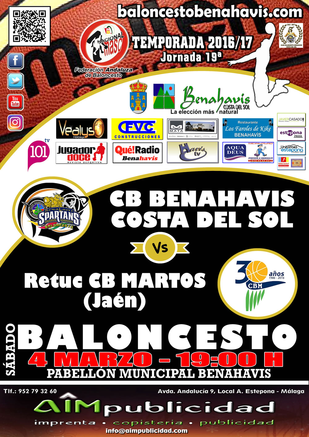 El encuentro de esta próxima jornada se disputará en el Pabellón Municipal de Deportes de Benahavís (Avda. de Las Margaritas, s/n), el próximo sábado 4 de Marzo 2017, a las 19:00 horas, con ENTRADA GRATUITA para todos los asistentes.