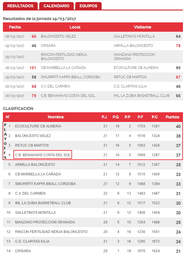 Con este resultado el equipo de CB Benahavís Costa del Sol sigue en el cuarto lugar de la tabla, con un balance de 16 victorias y 5 derrotas, con 37 puntos. Esta empatado con el tercero «Martos» y a una sola victoria del «Vélez» que sigue segundo.