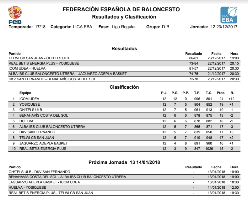 Con este resultado, el equipo de Benahavis se encuentra con un balance de 6 victorias y 6 derrotas, situandose en la 4ª plaza de la clasificacion provisional de la EBA (D-B).