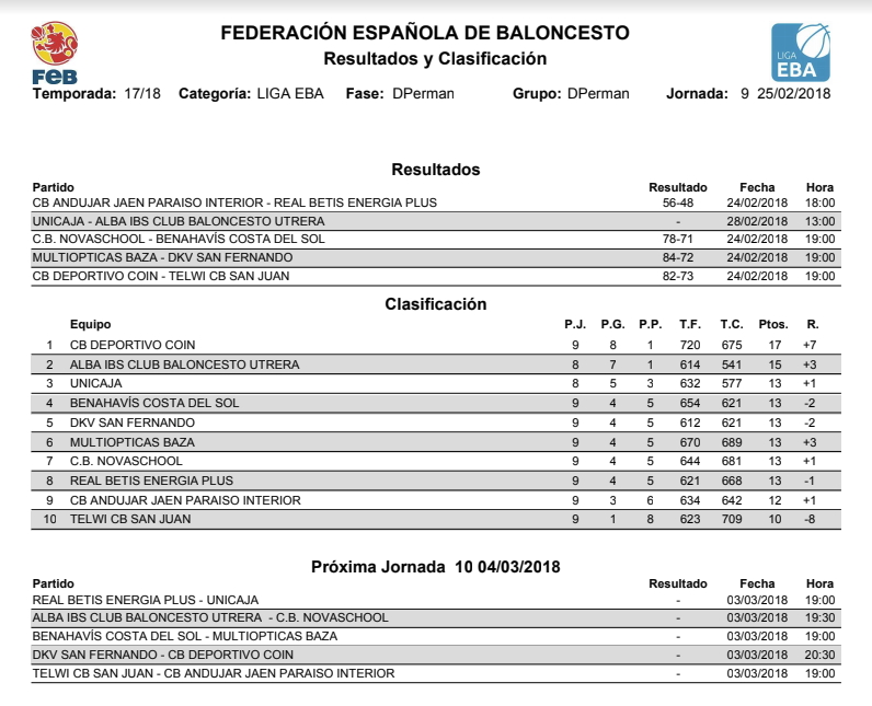 Con este resultado el CB Benahavis sigue situado en la 4ª posición de la tabla provisional de clasificación, de un total de 10 equipos, que pretenden eludir las 3 ultimas posiciones. Quedan 9 partidos para acabar esta Fase.
