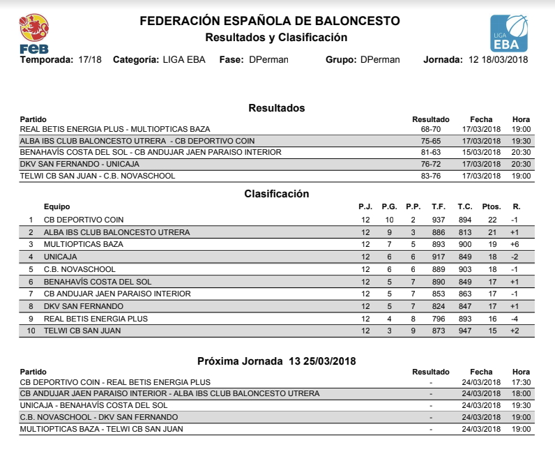 Primer triunfo del CB Benahavis en la Fase de Permanencia en la Liga EBA (D), que le deja con un balance global de 5 victorias y 7 derrotas, 6º clasificado, junto con otros dos equipos.