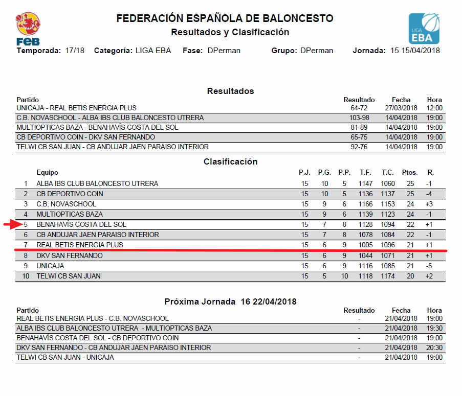 Con este resultado el CB Benahavis Costa del Sol, con un balance de 7 victorias y 8 derrotas, se sitúa en la 5ª posición de la tabla provisional de la clasificación, empatado con el 6º, a tres encuentros para finalizar esta Fase de Permanencia.