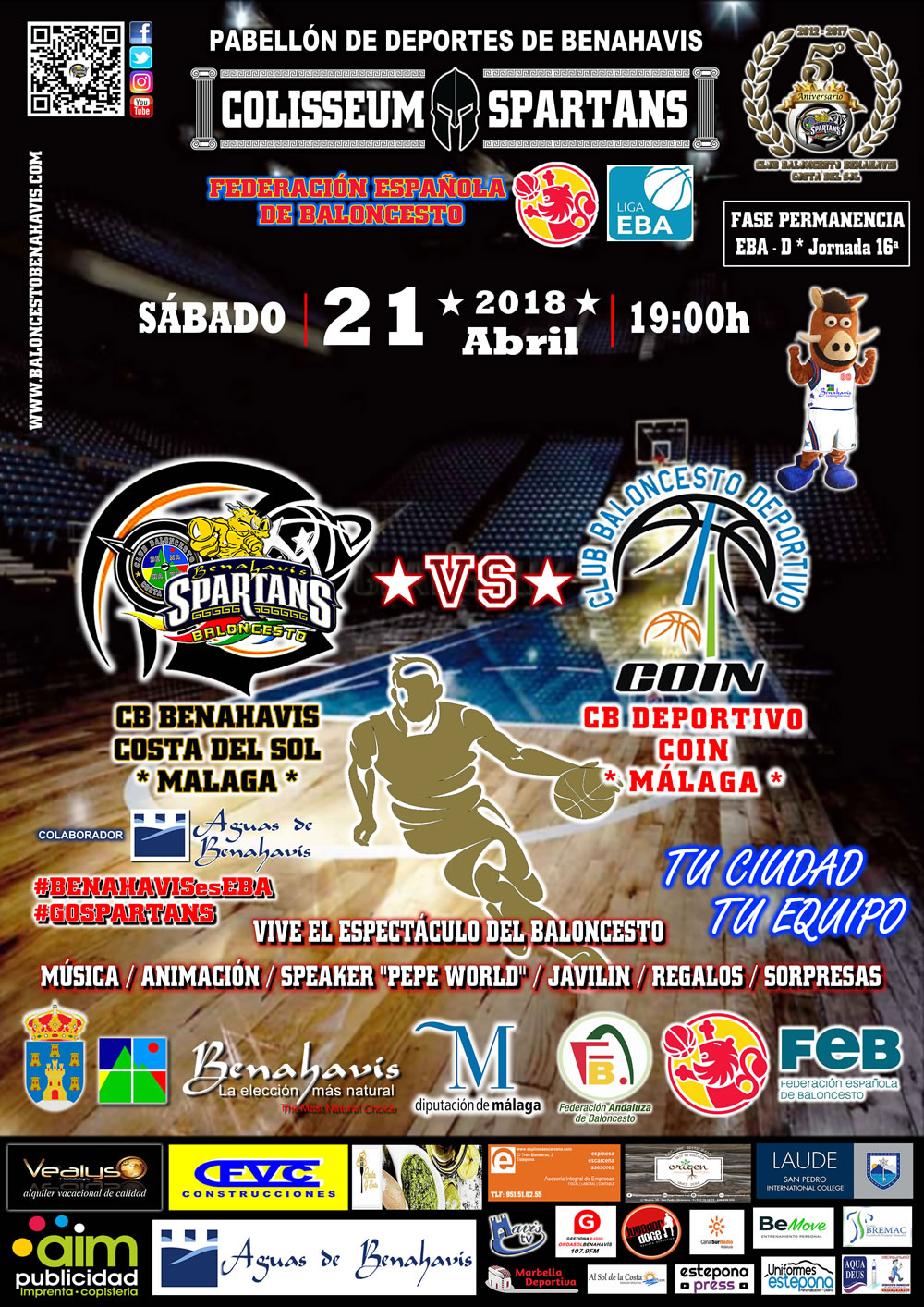 La 16ª Jornada de Liga EBA (D-Permanencia) se disputará en el Pabellón de Deportes de Benahavís (Avda. de Las Margaritas, s/n), este sábado 21 de Abril 2018, a las 19:00 horas, con ENTRADA GRATUITA para todos los asistentes.