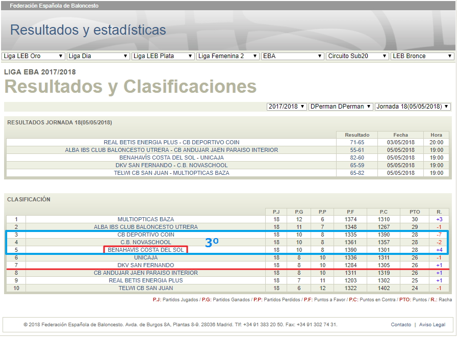 Una victoria que le deja con un balance global final de 10 victorias y 8 derrotas, 3º clasificado, empatado con otros dos equipos, y que confirma con méritos deportivos la Permanencia en la categoría EBA.