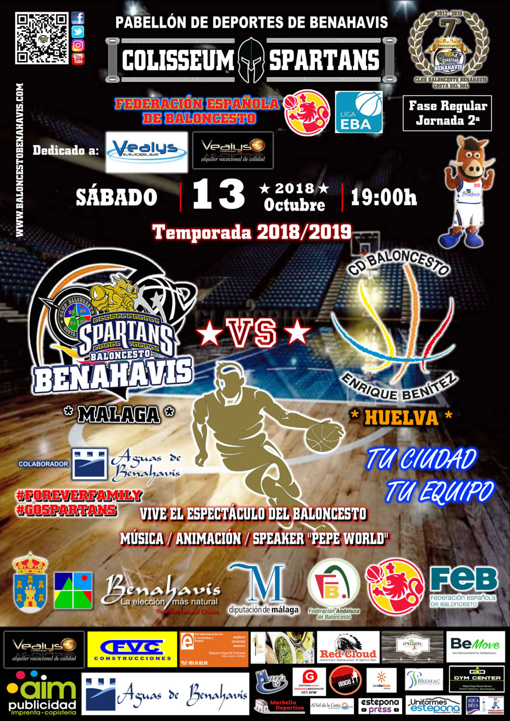El encuentro de esta 2ª jornada de Liga EBA (D-B) se disputará en el Pabellón Municipal de Deportes de Benahavís (Avda. de Las Margaritas, s/n), el «COLISSEUM SPARTANS«, este próximo sábado 13 de Octubre 2018, a las 19:00 horas, con ENTRADA GRATUITA para todos los asistentes.