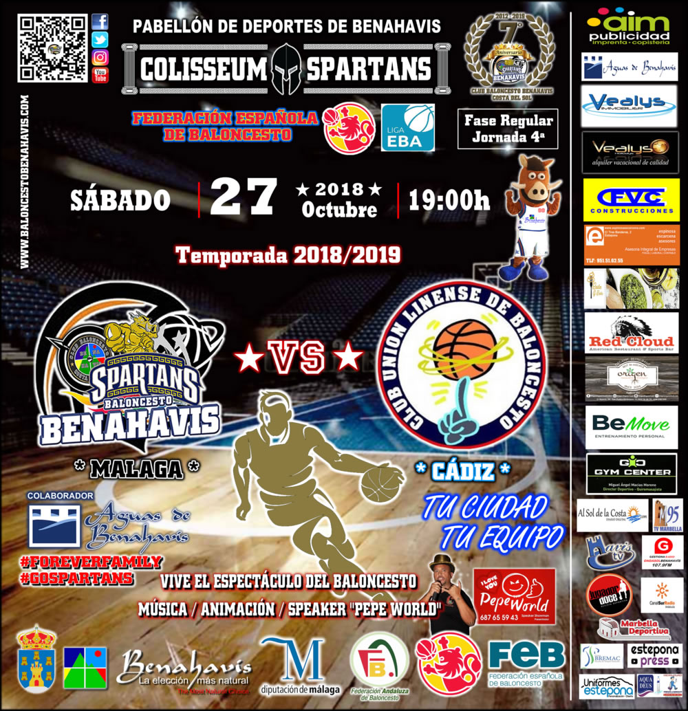 El encuentro de esta 4ª jornada de Liga EBA (D-B) se disputará en el Pabellón Municipal de Deportes de Benahavís (Avda. de Las Margaritas, s/n), el «COLISSEUM SPARTANS«, este próximo sábado 27 de Octubre 2018, a las 19:00 horas, con ENTRADA GRATUITA para todos los asistentes.