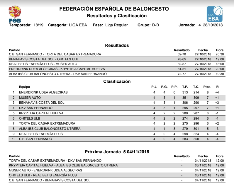 El siguiente encuentro correspondiente a la jornada 5ª de la Liga EBA, Grupo D-B, será en tierras gaditanas, el próximo domingo 4 de noviembre 2018, a las 19:00h, el pabellón «El Parque», frente al CB San Fernando.