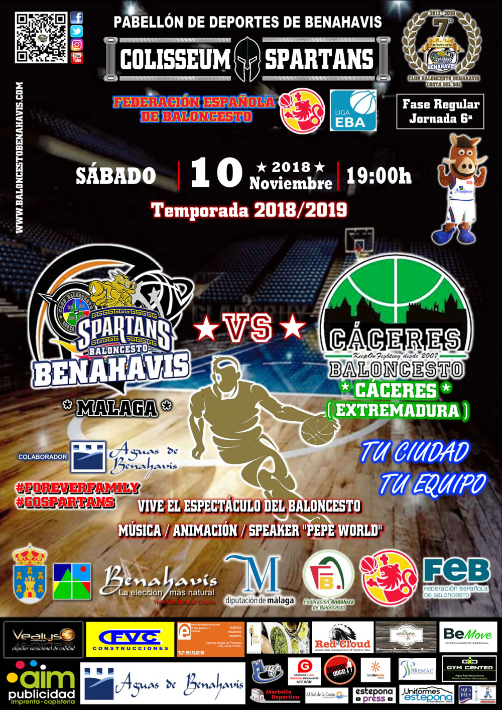 El encuentro de esta 6ª jornada de Liga EBA (D-B) se disputará en el Pabellón Municipal de Deportes de Benahavís (Avda. de Las Margaritas, s/n), el «COLISSEUM SPARTANS«, este próximo sábado 10 de Noviembre 2018, a las 19:00 horas, con ENTRADA GRATUITA para todos los asistentes.