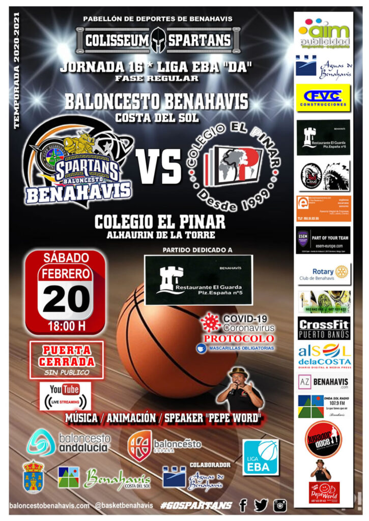 El Club Baloncesto Benahavís Costa del Sol regresará esta semana a su pabellón, el próximo sábado 20 de febrero 2021, para disputar en el «Colisseum Spartans», la Jornada 16ª de Liga EBA Grupo D-A, donde se enfrentará en otro «Derbi» provincial, a partir de las 18:00 horas, al equipo del “COLEGIO EL PINAR», de Alhaurín de la Torre (Málaga).