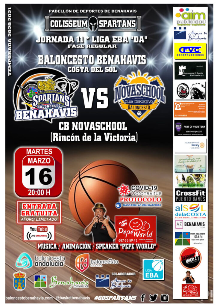 El Club Baloncesto Benahavís Costa del Sol volverá a jugar esta semana en su pabellón, el próximo martes 16 de marzo 2021, para disputar en el «Colisseum Spartans», la Jornada 11ª de Liga EBA Grupo D-A, que se tuvo que aplazr, donde se enfrentará en «Derbi» provincial, a partir de las 20:00 horas, al equipo de “NOVASCHOOL», del Rincón de la Victoria (Málaga).