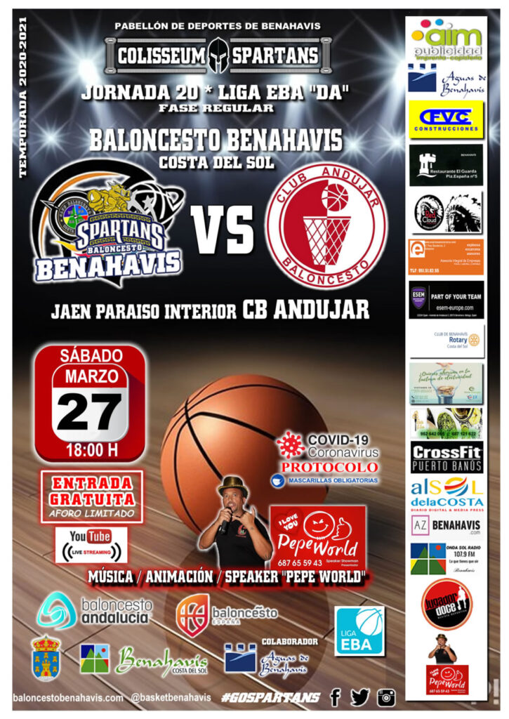 El Club Baloncesto Benahavís Costa del Sol volverá a jugar esta semana en su pabellón, el próximo sábado 27 de marzo 2021, para disputar en el «Colisseum Spartans», la Jornada 20ª de Liga EBA Grupo D-A, el primero de los cuatro consecutivos que va a disputar en su feudo, a partir de las 18:00 horas, contra el equipo de “JAEN PARAISO INTERIOR CB ANDUJAR».