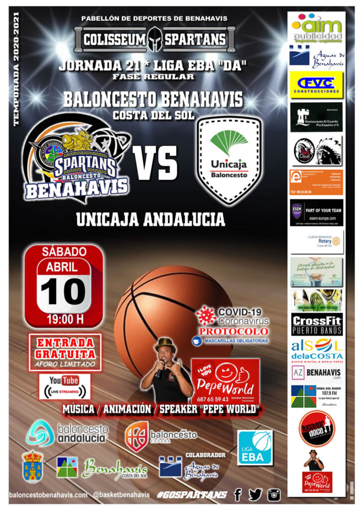 El Club Baloncesto Benahavís Costa del Sol disputará su último partido como local, de esta Fase Regular de competición, de nuevo en su pabellón, el próximo sábado 10 de abril 2021, en el “Colisseum Spartans”, la Jornada 21ª de Liga EBA Grupo D-A, donde se enfrentará al equipo de “UNICAJA ANDALUCÍA» de Málaga, a partir de las 19:00 horas.