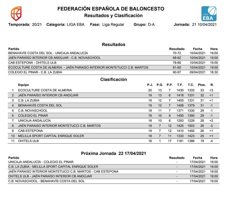 Última jornada 22ª: Sábado 17 de abril 2021, 19:00h (horario unificado), en el pabellón del equipo de Novaschool (Rincón de la Victoria).
