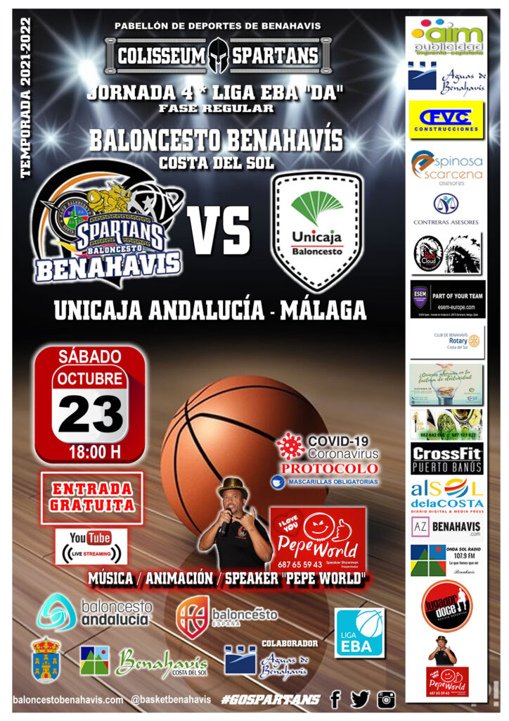 El Club Baloncesto Benahavís Costa del Sol regresará a su pabellón el próximo sábado 23 de octubre 2021, para disputar en el “Colisseum Spartans”, la Jornada 4ª de la Liga EBA Grupo D-A, donde se enfrentará a partir de las 18:00 horas, al equipo malagueño del “UNICAJA ANDALUCÍA», filial del que milita en la ACB Liga Endesa.