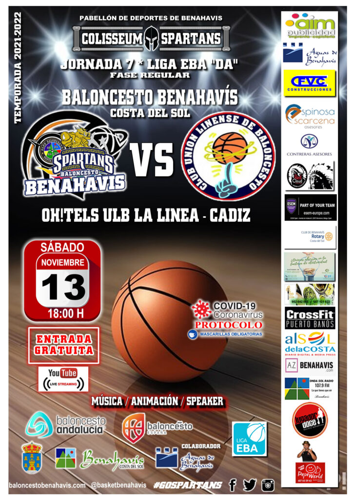 El Club Baloncesto Benahavís Costa del Sol competirá de nuevo esta semana en su pabellón, el próximo sábado 13 de noviembre 2021, para disputar en el “Colisseum Spartans”, la Jornada 7ª de la Liga EBA Grupo D-A, donde se enfrentará a partir de las 18:00 horas, al equipo gaditano del “OH!TELS ULB LA LINEA (Cadiz)”.
