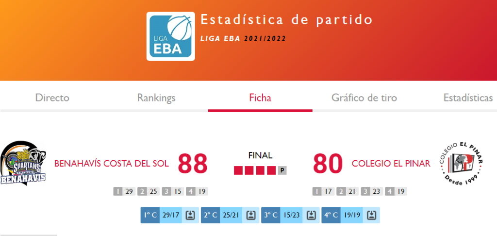 💪🎉!! Tras la victoria previa por 74 a 44 del Cadete Masculino cantera filial «Marbella Basket – Benahavis», frente al CAB Estepona, que se jugaba justo antes, enorme triunfo el logrado en la tarde del sábado 27 de noviembre por los Spartans de Benahavis, que dan de nuevo su mejor version y ganaban por fin en casa por el resultado de 88 a 80, con numeroso publico (mas de 100 personas), frente al dificil equipo de » Colegio El Pinar » de Malaga, en la jornada 9° de Liga EBA T2021/22, logrando asi su cuarta victoria de la temporada, la segunda consecutiva, y remontando hasta la 6° plaza de la clasificacion provisional.