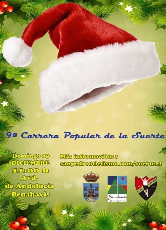 El Domingo 19 de diciembre, el Ayuntamiento organiza también como cada año la popular «Carrera de La Suerte», en su 9ª Edición, junto al Club Atletismo San Pedro de Alcántara, será a las 11:00h en la Avda. de Andalucía de Benahavís.