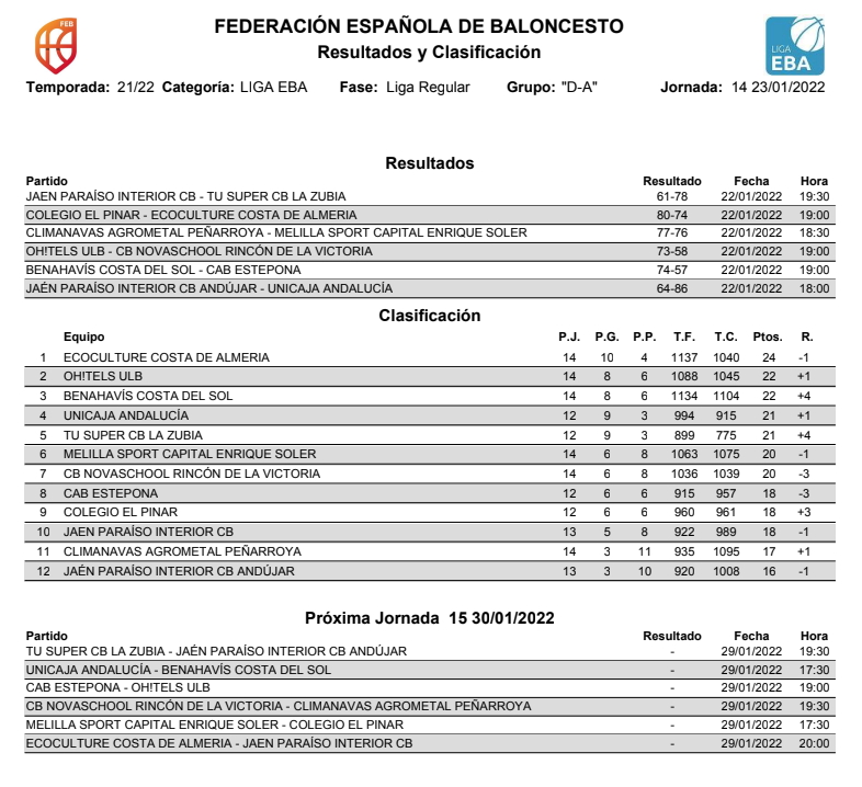 Jornada 14° de Liga EBA T2021/22, logrando el CB Benahavís su octava victoria de la temporada, afianzando su posición en la zona noble de la tabla de clasificación.