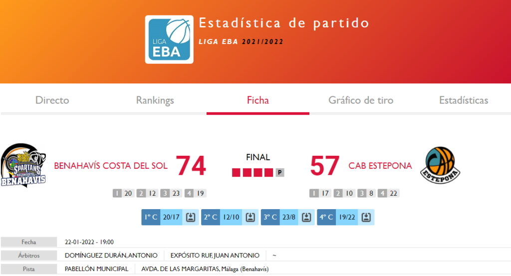 Una gran victoria la lograda en la tarde del sábado 22 de enero de 2022, a las 19:00h, por los «Spartans» de Benahavis, que ofrecieron de nuevo su mejor versión de juego y ganaban ante un cada vez mas numeroso publico, que llenaron las localidades a pie de pista y gran parte de la tribuna superior, con aficiones de ambos Clubs, mas dos equipos de cantera Cadete Femenino del Marbella Basket, club filial del CB Benahavís, que levantaron el telon con un gran encuentro oficial, y que se quedaron para ver al primer equipo de Liga EBA.