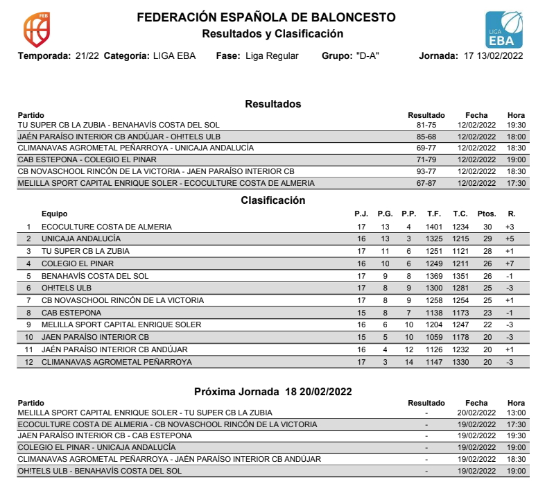 El equipo de Benahavis, con este último resultado obtiene un balance de 9 victorias y 8 derrotas, y se sitúa en la 5ª posicion de la tabla.