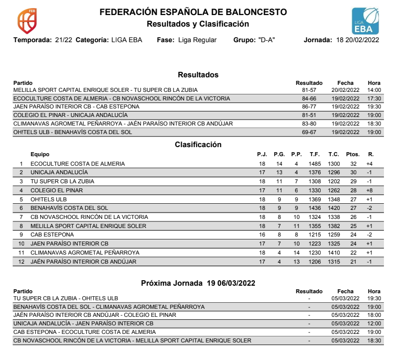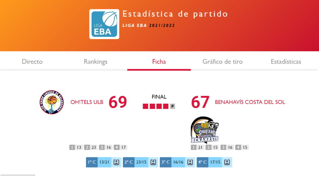 El pasado sabado 19 de febrero 2022, a las 19:00h, en la cancha linense, se pudo vivir un partido muy igualado, jornada 18ª de Liga EBA DA, T21/22, con dos equipos de la zona media de la tabla, el OH!Tels ULB frente al CB Benahavis Costa del Sol.