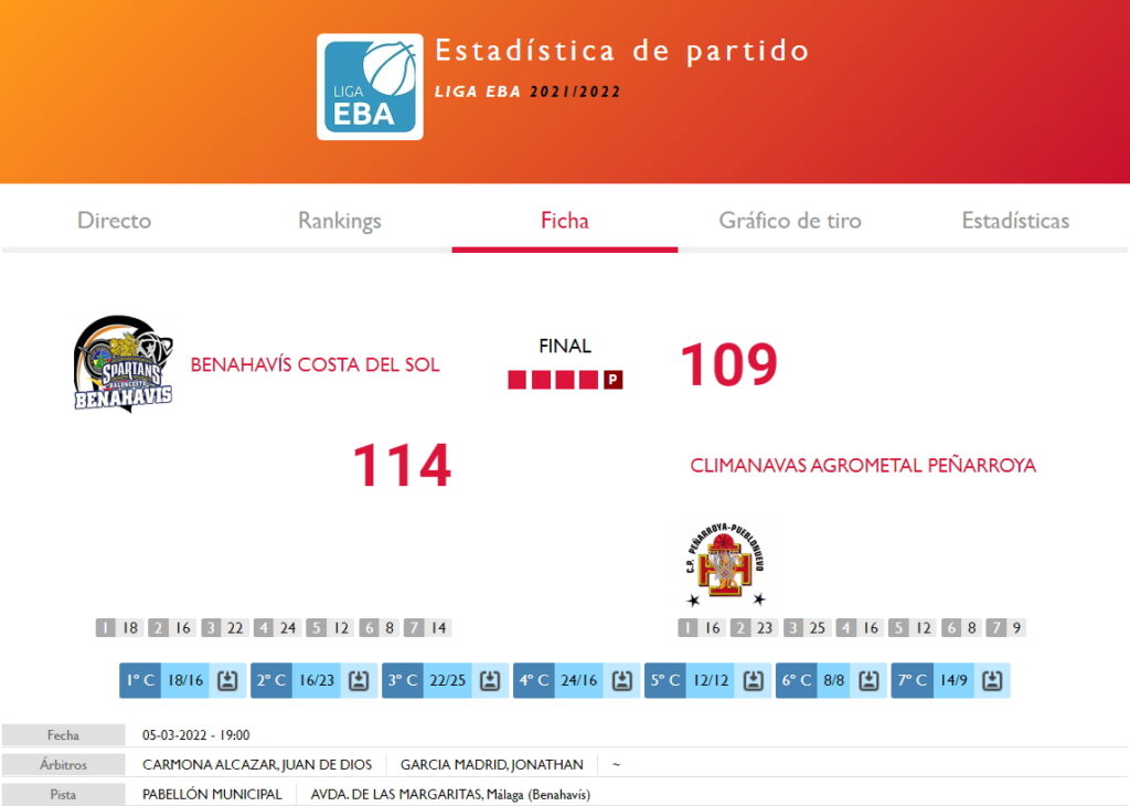 Esta vez el equipo de Benahavís salía mas enchufado en ataque con varias anotaciones que le distanciaban de Peñarroya, que se fueron acercando al final de estos 5 minutos adicionales, pero los Spartans de Benahavís seguían muy sólidos en defensa, y consiguieron ante el júbilo de su público, y los que presenciaron via Streaming, «no apto para cardiacos», vencer en un irrepetible partido, por el resultado final de 114 a 109.