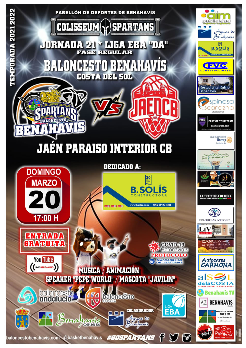 Viviremos de nuevo una gran tarde de Basket con el partido que el Club Baloncesto Benahavís Costa del Sol jugará en su pabellón, este próximo domingo 20 de marzo de 2022, para disputar en el “Colisseum Spartans”, la Jornada 21ª de Liga EBA Grupo D-A, última como local, donde se enfrentará a partir de las 17:00 horas, al equipo jienense del “JAÉN PARAISO INTERIOR CB«. El cambio de día y hora habitual se ha producido debido a la coincidencia con la «Fiesta Premini FAB Andaluza 2022», que tiene lugar durante todo el fin de semana en el pabellón de Benahavís.