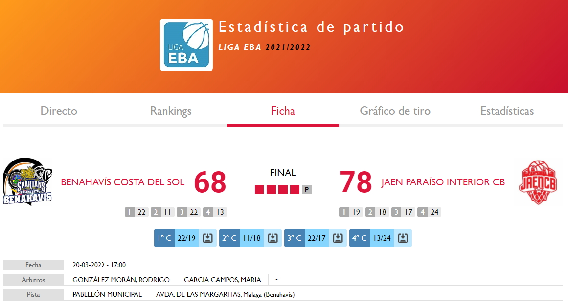 Con los dos equipos con la permanencia en la categoría EBA asegurada, el partido prometía ser un choque atractivo, Benahavís para intentar permanecer en la zona media de la tabla, y Jaen CB para escalar alguna posición final. El equipo de Benahavís, que presentaba hasta cuatro importantes bajas en su plantilla, dos por lesiones sufridas la semana pasada, estuvo luchando con su corto efectivo hasta el final, hasta el último cuarto, donde el excepcional acierto de Javier Santabarbara, jugador referente del equipo jienense, 6 de 8 en triples, 26 puntos, hacía la diferencia, y le daba la victoria final al equipo de Jaén Paraiso Interior CB, por 68 a 78.