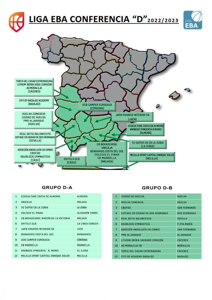 La FEB ha realizado la distribución de equipos para el Grupo D de EBA, el sorteo de los calendarios para esta Temporada 22-23 se realzará en los próximos días, en las oficinas de Madrid y se publicarán a continuación.