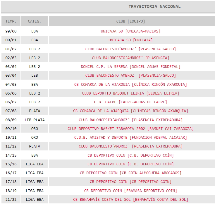 Se puede comprobar su dilatada trayectoria deportiva, con su inicio de formación en el Unicaja de Málaga, saltando a ligas nacionales EBA con este club, y evolucionando en varios equipos del panorama español, en categorías superiores: LEB 2, LEB, LEB Plata, y llegando incluso a formar parte del Basket CAI ZARAGOZA, y del FUNDACION ADEPAL ALCAZAR de LEB Oro. Jugador referente del baloncesto malagueño, y es un gran honor poder contar con el en nuestro equipo de Benahavís, una temporada mas.